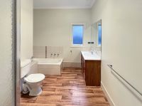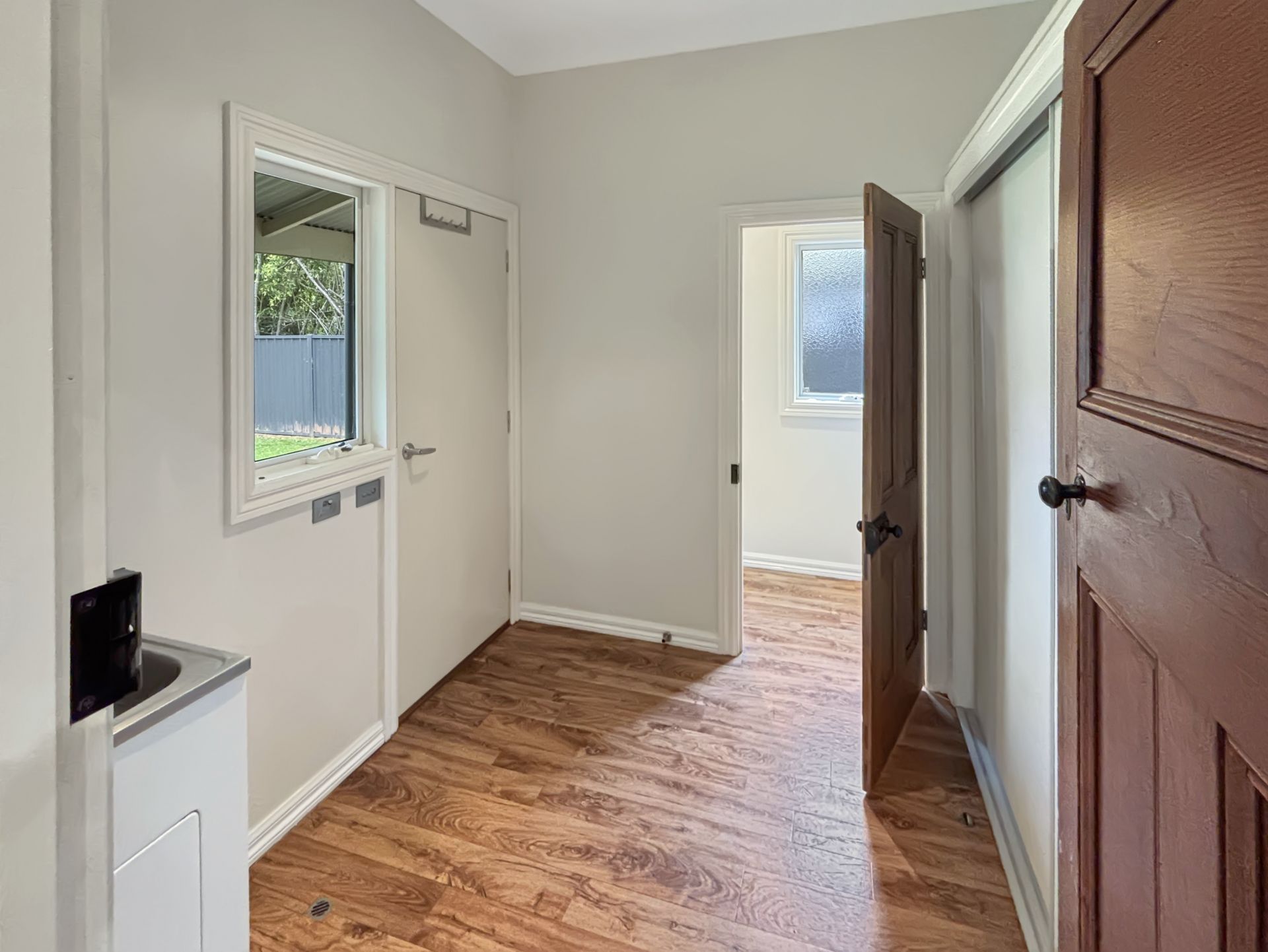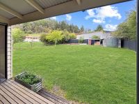 The home offers three bedrooms – two with large built-in cupboards – and ceiling fans in every room. A modern country-style kitchen includes an electric cooktop, dishwasher, and pantry, flowing into a spacious lounge and living area. A split system ensures year-round comfort, and the living space opens directly onto a deck, perfect for relaxing or entertaining.
