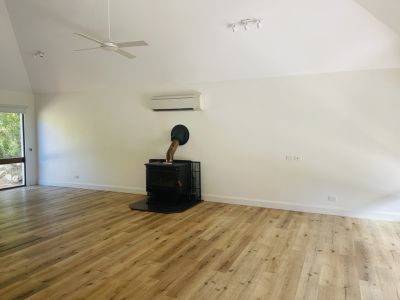 There is a spacious living/dining area complete with a huge wood fire and split system heating and cooling for year-round comfort. The modern kitchen is well-equipped with gas cooking and ample storage and a dishwasher.