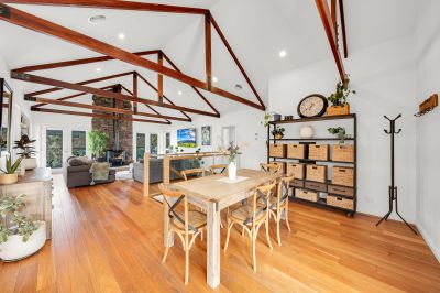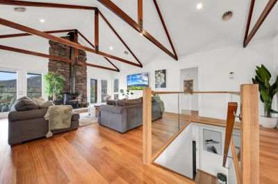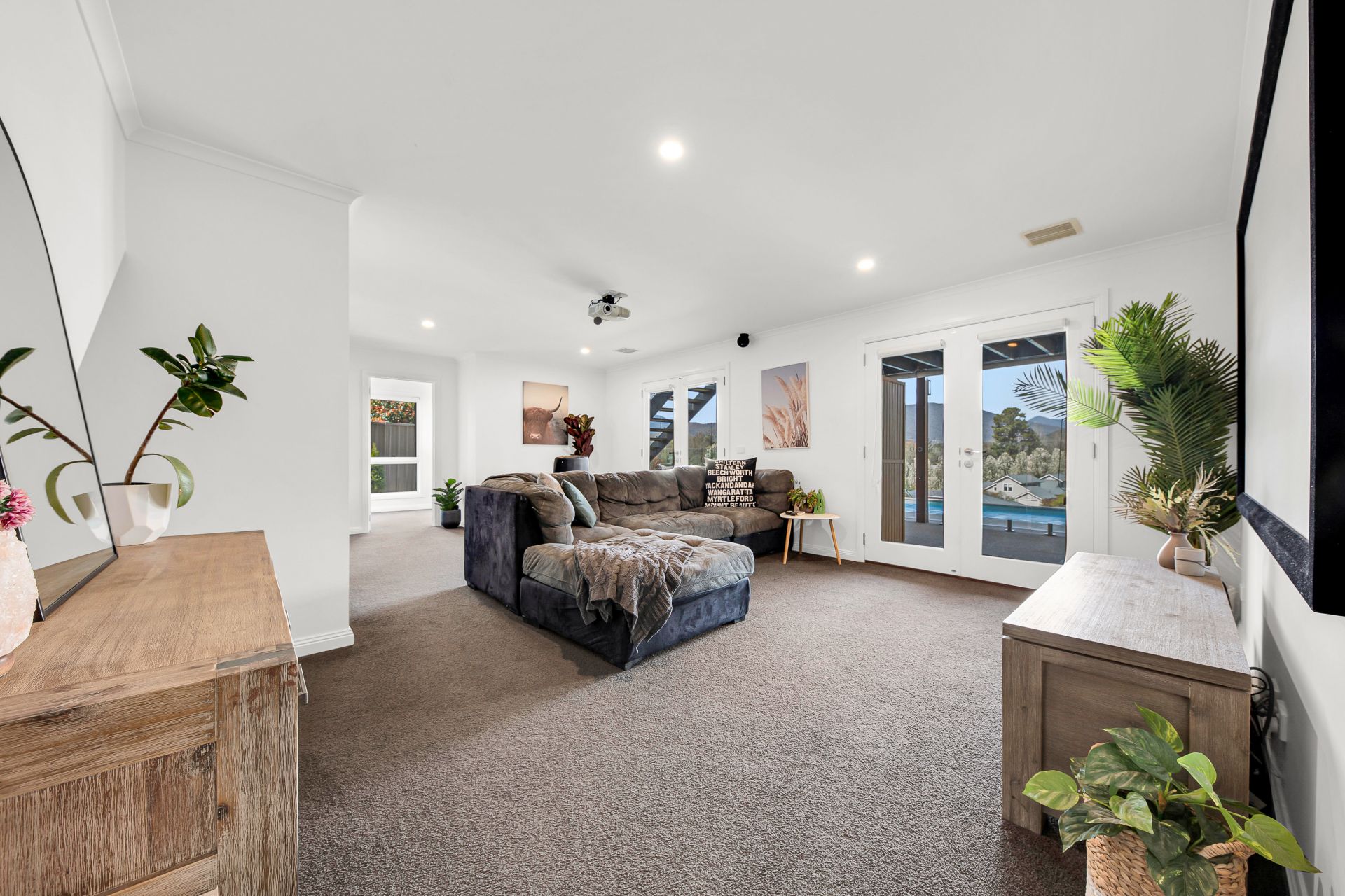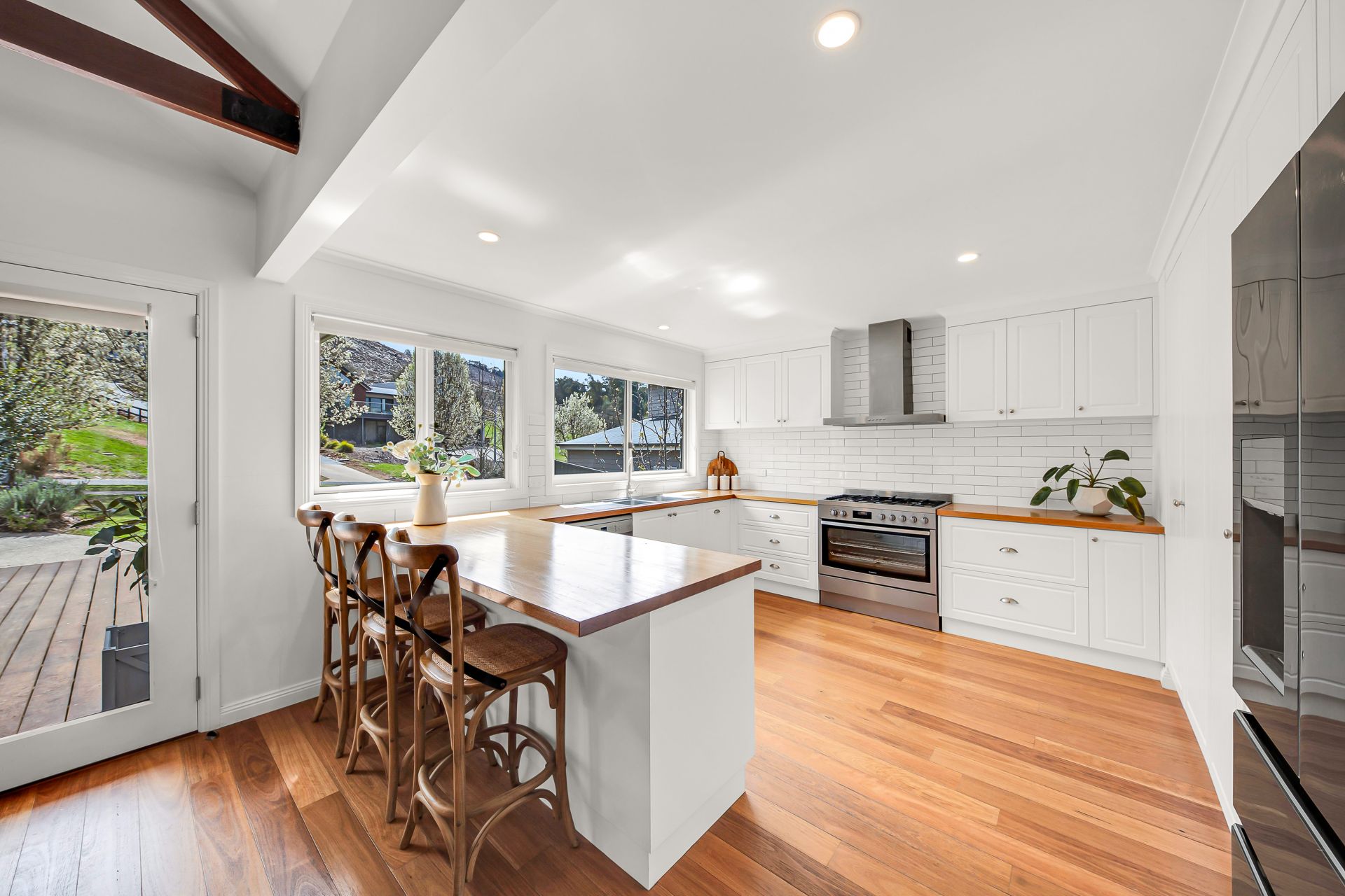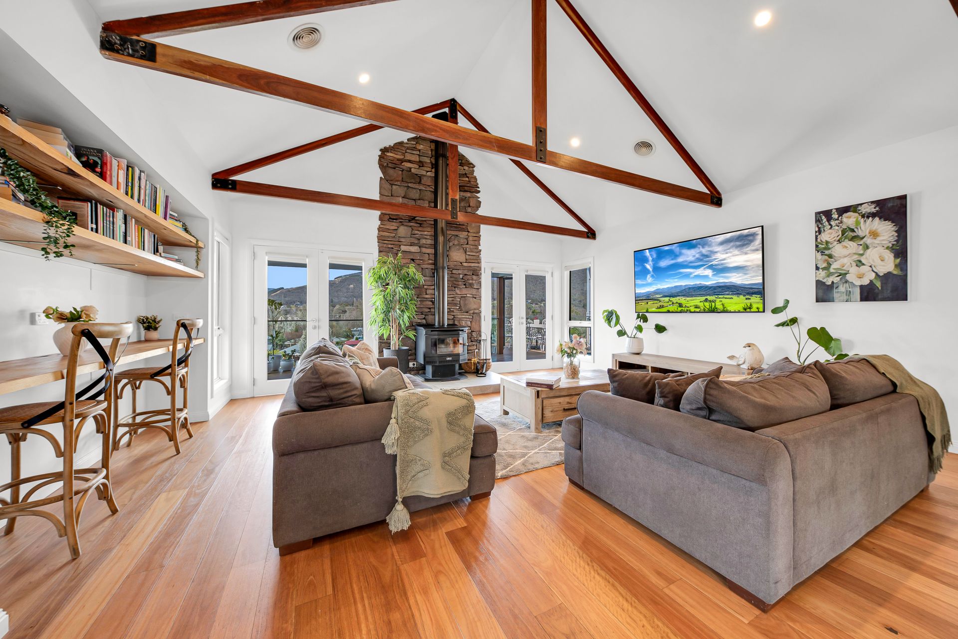 At the heart of the home, conversations flow as easily as the open-plan design itself. The kitchen is spacious and well-appointed, offering ample bench space, quality appliances and plenty of storage. From here, the adjacent meals area spills into cosy moments in the living room, while wide glass doors open the home to sunlight and valley views. These doors open out onto the large timber deck, a place where you'll dine under open skies and enjoy those sweeping views of the valleys and hills beyond.