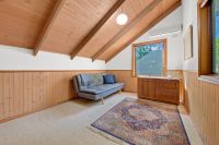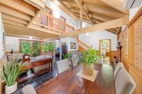 Upstairs, the home offers two additional bedrooms along with a study that can easily function as a fourth bedroom if needed, along with the flexibility of a generous sitting room. This space overlooks the living space below, highlighting the home's tall ceilings and airy design while creating a beautiful connection between the two levels.