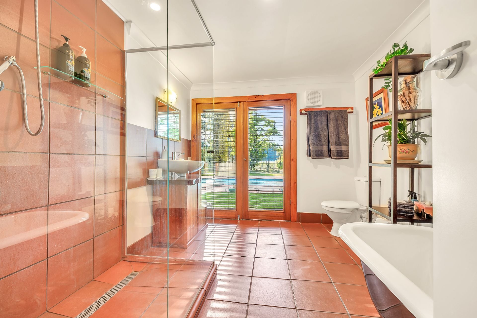 The main residence is a warm and inviting four-bedroom home designed for comfort in every season. Open-plan living is centred around a striking local granite stone fireplace, while passive solar design ensures efficiency throughout the year. A north-facing sunroom with bi-fold doors opens to the pool, spa and outdoor entertaining area, and the beautifully finished bathroom features terracotta tiles and a deep clawfoot bath.