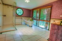 The family bathroom is huge with a free-standing bath, shower, vanity and separate toilet.