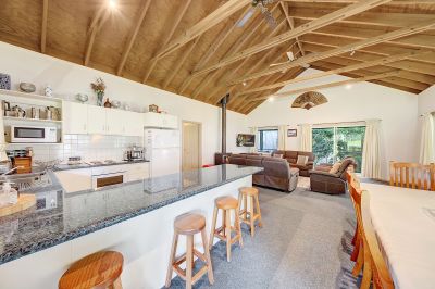 Step into your light filled open plan living space with its timber lined cathedral ceiling, cosy slow combustion wood fire and enjoy direct access out on to your wrap around verandah.