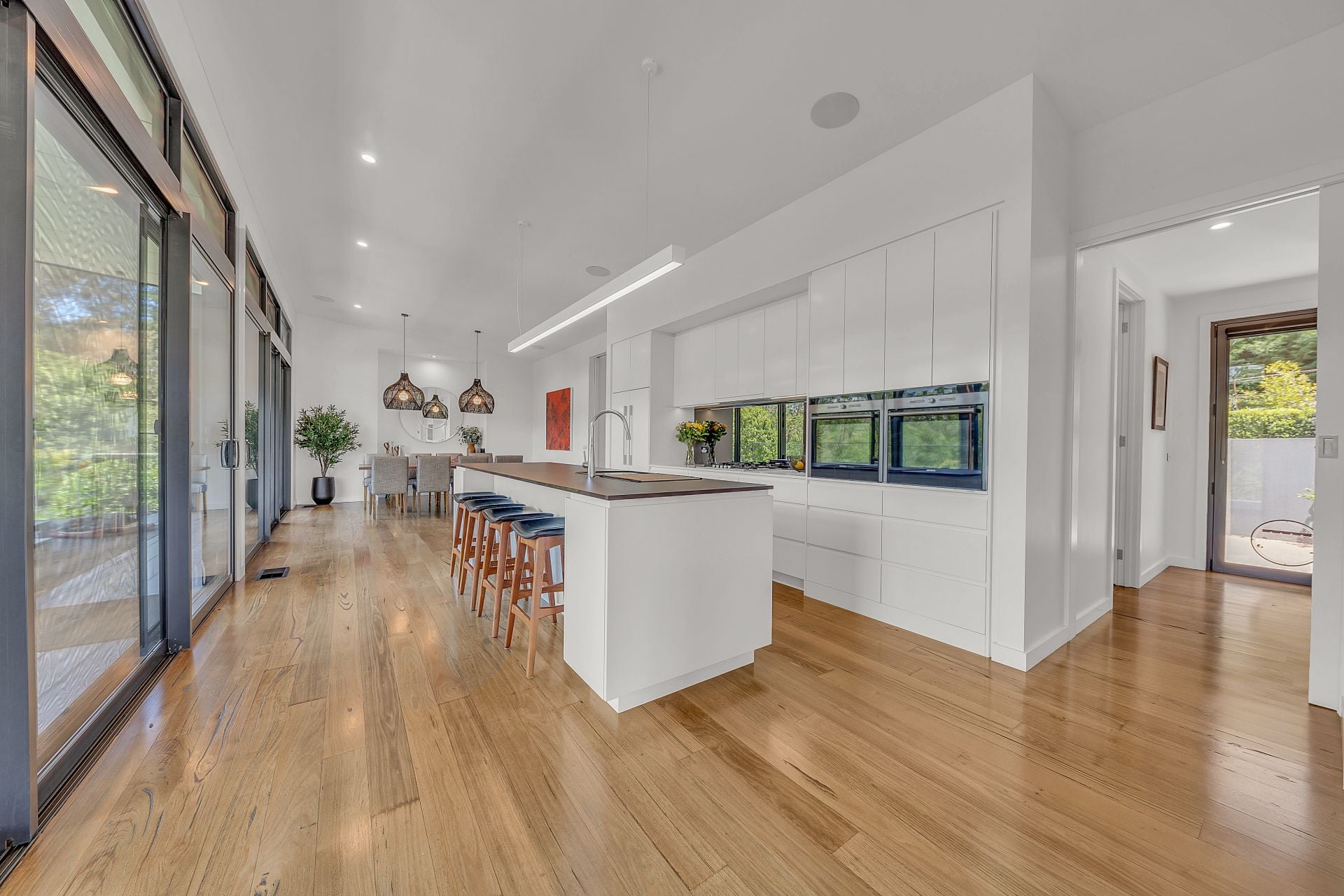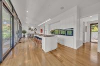 The heart of the home is the generous open-plan living area, centred around a chef's kitchen complete with a large central island and butler's pantry-ideal for entertaining, family gatherings or relaxed weekend mornings. Sliding doors stack back to reveal an elevated deck with outdoor kitchen, ample dining and lounge space, and a wall-mounted television, all overlooking the in-ground swimming pool and landscaped surrounds.