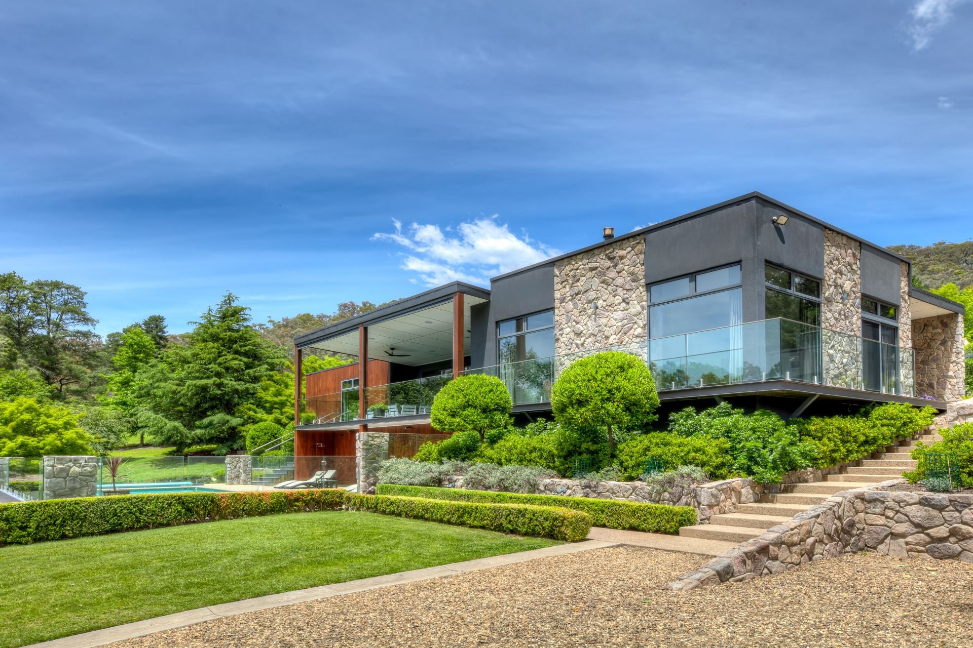 Set within a truly park-like setting of just under 2 acres, the home is surrounded by shady trees, mature gardens, striking stonework and open grassy spaces. Fully irrigated grounds via a deep underground bore that provides unlimited water supply, ensures year-round green grass and ease of maintenance while enhancing the sense of privacy and tranquillity.