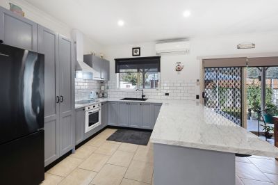 The kitchen is sure to impress any home chef, featuring generous cabinetry, expansive bench space, and contemporary finishes like an ivory subway tile splashback and matte black fixtures - both practical and stylish.
